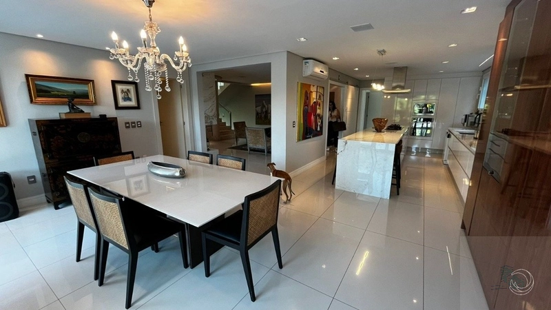 Casa residencial à venda em Jurerê Internacional. Com 4 suítes, toda semi-mobiliada, hall, pé direito alto, teto rebaixado, ar condicionado, lavabo, living, armários embutidos, cozinha planejada, alarme, área de serviço, despensa, estar íntimo, sala de Tv, sala para estar e sala de jantar, sacada, churrasqueira, piscina e possui 2 vagas de garagem. O uso de materiais nobres, como o mármore espanhol e o travertino, confere sofisticação e requinte aos espaços, enquanto o jardim e a vista panorâmica contribuem para uma atmosfera tranquila e relaxante. Essa combinação de luxo, conforto e elegância faz desta casa uma excelente opção para quem busca uma experiência de vida exclusiva em Florianópolis. A localização é privilegiada, pois fica a poucas quadras do Supermercado Imperatriz, Open Shopping e Praia.
